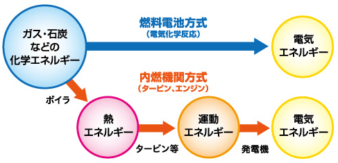 都市ガス等の燃料を改質して取り出した水素と空気中の酸素を化学反応させると水ができるが、この反応は発熱反応であり、電気と同時に熱も発生する。発電効率が高く、省エネ性・環境性にも優れている。